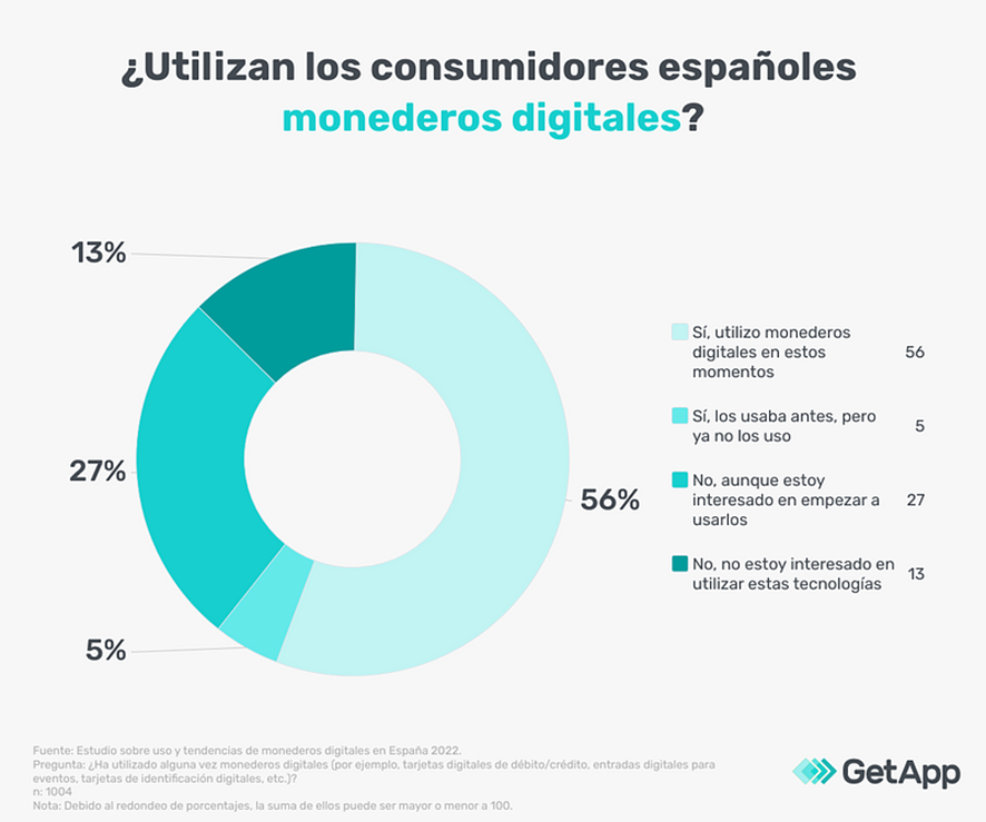 Los monederos digitales se están abriendo paso rápidamente entre los españoles: el 56% de los que tienen smartphone utiliza actualmente un wallet digital y un 27% está interesado en usarlo. Así lo indica la plataforma de opiniones de software empresarial GetApp, que ha realizado una encuesta en España sobre la adopción y uso de monederos virtuales.