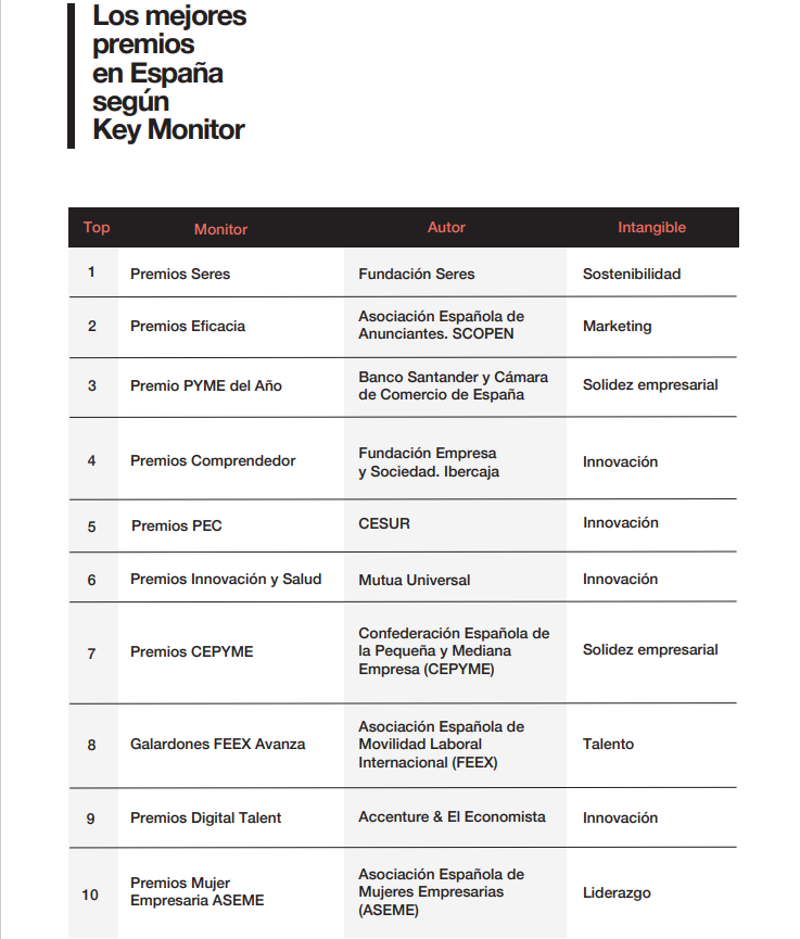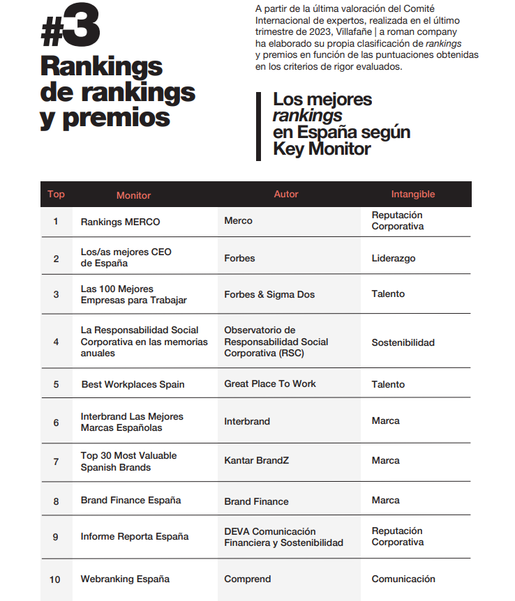 Villafañe, consultora recientemente adquirida por Roman, ha presentado recientemente un estudio sobre los mejores premios y rankings de intangibles reputacionales en España. El objetivo del mismo es poner en valor los procesos y procedimientos que siguen las mejores entidades que reconocen, a través de rankings y premios, la reputación y el buen hacer de las empresas en España. Esto es posible gracias a la implementación de la plataforma Key Monitor, desarrollada por Villafañe con el apoyo de Corporate Excellence, y la valoración de un comité de expertos que evalúa con criterio los monitores de intangibles presentados.