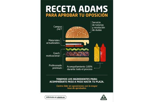 En un sector donde la comunicación suele repetir los mismos mensajes, colores y enfoques, ADAMS apuesta por un concepto innovador inspirado en el mundo culinario, un terreno universal y fácilmente reconocible, que permite explicar de forma visual y cercana cuáles son los “ingredientes” necesarios para aprobar una oposición.