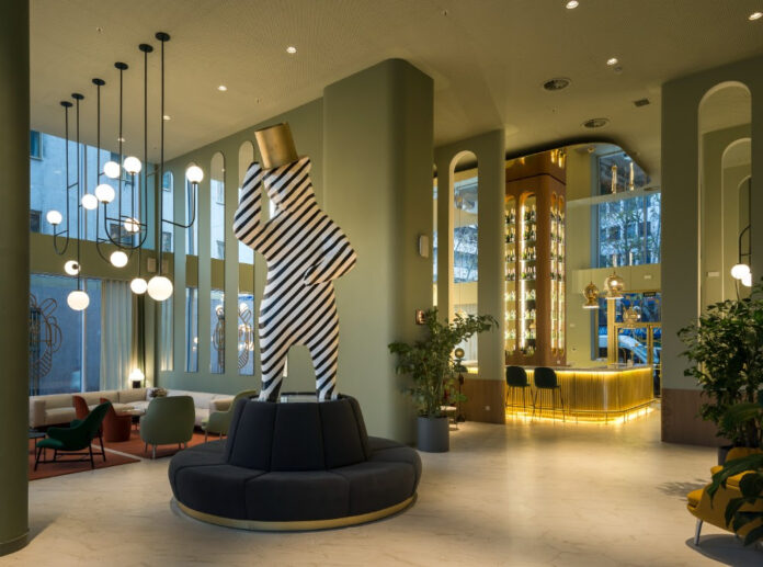 «Me dediqué de lleno a la creación de un espacio muy especial y único que representará una nueva visión de España alejada de la estética tradicional. Además de ser mi ciudad natal, para mí Madrid representa la diversidad y la riqueza de España», explica Hayon. En esta línea cabe destacar una de las esculturas más llamativas y lúdicas del espacio y que encontramos en el vestíbulo: un surrealista enorme oso estampado con rayas –aludiendo al escudo de Madrid– que da la bienvenida a los huéspedes.