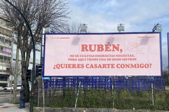 La agencia de marketing Mardy Bum ha instalado una valla de ocho metros en el centro de Vigo en la que una seguidora ha pedido matrimonio a su pareja, Rubén.