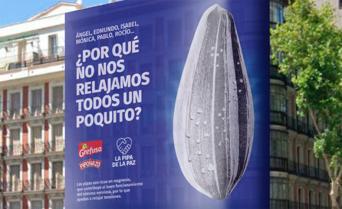 Entre los recientes ejemplos de esta fórmula comunicativa, se encuentran las de Grefusa, la Copa Davis o Joan Laporta. El primero, Grefusa, instaló en estos meses dos lonas distintas en Madrid, ambas dentro su campaña ‘Pipa de la paz’ en la que invitaba a relajarse con sus pipas. Una con motivo de las elecciones madrileñas, en la que apelaba directamente a los candidatos, y una segunda de cara al apasionante y madrileño final de la Liga de fútbol.