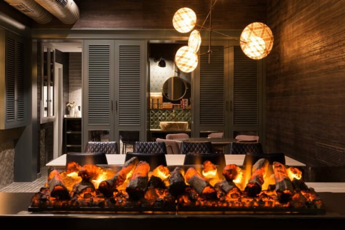 Podrán disfrutar de la zona de bienvenida, esta cuenta con una barra alta con sillas para poder brindarles un buen recibimiento, la zona de estar, con un córner con sofás, mesas y un pequeño e íntimo rincón a la luz de nuestra chimenea de vapor, la zona de reunión, con una capacidad para 20 invitados sentados, también pudiéndose configurar como zona de cóctel, y por último, la zona office, una estancia totalmente equipada con dos hornos, microondas, nevera, y cooking rak. En la planta inferior, encontramos la bodega, ideal para reuniones privadas, cuenta con una gran mesa con capacidad para 10 personas, es perfecta para presentaciones de producto, reuniones de empresa.