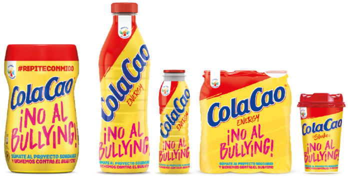Como novedad, este año la marca no solamente ha rediseñado la etiqueta de su bote clásico de ColaCao, sino que el diseño ha invadido el resto de los formatos, tanto sus variedades de cacao en polvo como su familia de batidos, para alzar la voz aún más alto en contra del bullying.