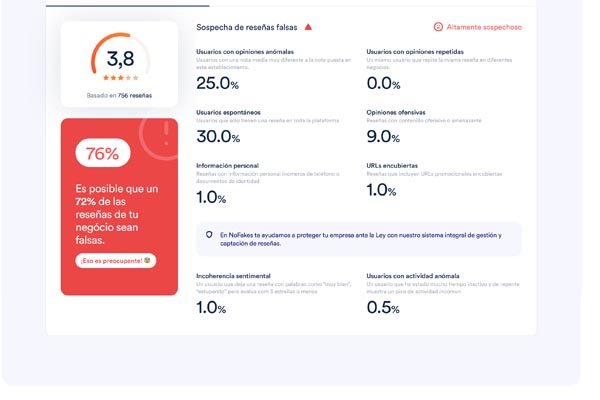NoFakes, además de crear un sello de certificación avalado por una triple validación, ha desarrollado una herramienta que permite medir la cantidad de reseñas falsas que tienen los negocios en los diferentes buscadores.