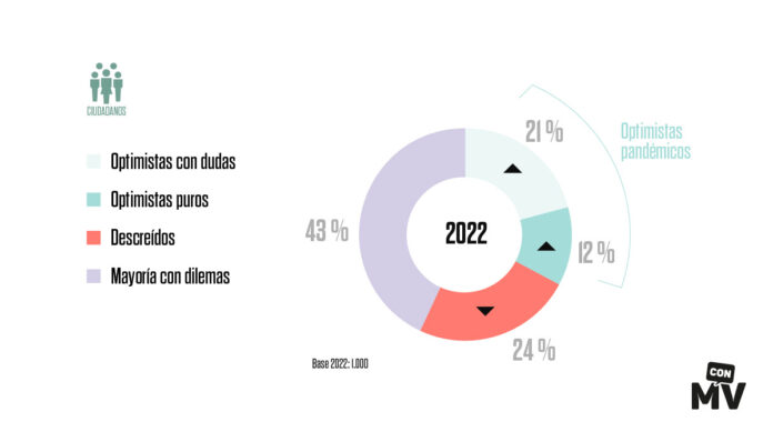 Si en el informe realizado hace ahora un año se percibía un desplome del optimismo marcado por el duro confinamiento, ahora, pese a que la pandemia no ha terminado, la llegada de las vacunas y la reducción de las restricciones ha hecho que la situación sea notablemente distinta, y eso ha tenido un reflejo en la relación de los ciudadanos y las marcas. Entre los extremos –los ciudadanos más optimistas (33%) y los más descreídos (24%) en su relación con las marcas–, la mayor parte de la población se enmarca dentro del grupo con dilemas (43%) que, aunque caen en ciertas contradicciones, aspiran a consumir de forma más consciente y tienden de nuevo hacia el optimismo. Una mayoría, en definitiva, predispuesta a entablar relaciones basadas en valores con las marcas.