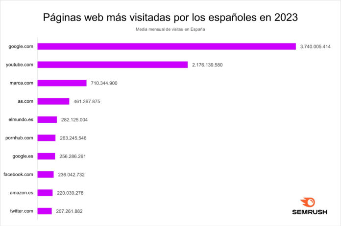Según el análisis elaborado por Semrush, Google.com es el sitio más visitado en España, acumulando un tráfico de más de 3 mil millones de visitas mensuales. Está es una tendencia que se repite en la gran mayoría de países, al igual que con el caso de YouTube, que ocupa la segunda posición con más de 2 mil millones de visitas. A nivel global, las redes sociales ocupan la mayoría de los puestos en la tabla. YouTube y Facebook en segunda y tercera posición, Twitter, Instagram y Reddit en séptima, octava y novena. Sin embargo, en España, Facebook ocupa el noveno puesto con 236 millones de búsquedas y Twitter el décimo con 207 millones. Instagram queda relegada a la dieciseisava posición y Reddit no alcanza la popularidad suficiente para aparecer entre las 20 primeras páginas.
