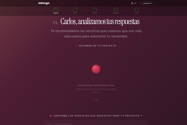 Una vez completado el diagnóstico inicial, el sistema genera un espacio privado donde el cliente puede consultar el enfoque recomendado para su proyecto, recibir una propuesta detallada con el desglose de servicios y precios, y hasta firmar el contrato de forma digital y hacer el seguimiento de la evolución del trabajo. Cada fase se alimenta de la información de la anterior, lo que reduce los tiempos de gestión y mejora la calidad de las propuestas.