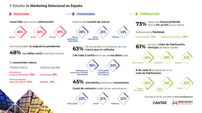 Hoy en día el comprador se mantiene fiel a sus marcas predilectas, pero que está dispuesto a probar nuevas opciones, siempre que el precio sea atractivo, y le gusta seguir abriendo el buzón para consultar las ofertas en folletos impresos… Estas son algunas de las conclusiones del V Estudio de Marketing Relacional realizado por Mediapost en colaboración con la Asociación de Marketing de España.