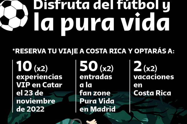 Turismo de Costa Rica sigue estando presente en España también a través del fútbol. El país lanza una acción táctica, con motivo del encuentro del 23 de noviembre en Catar; a través de tres sorteos y a alianzas estratégicas con grandes marcas del sector turismo en España, durante un período de algo más de dos meses, que comenzará el 15 octubre y se extenderá hasta el 18 de diciembre.