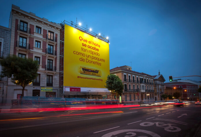 La nueva campaña de Donettes® rebaja el odio y reivindica la amistad heterogénea y el buen rollo, a través de una acción en exterior que lucirá el lema “Menos Hate, más Donetting”, en el barrio de Malasaña, en Madrid, desde el 18 de mayo hasta el 15 de junio.