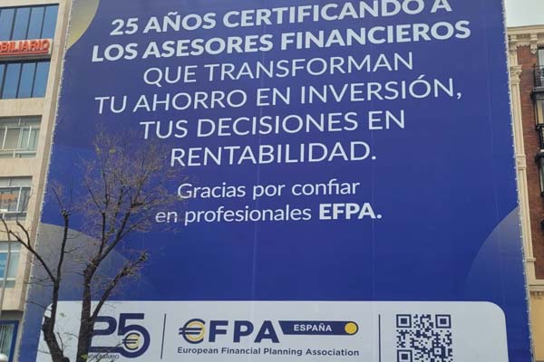 Como parte de su estrategia de visibilidad, EFPA España ha instalado dos lonas de gran formato en ubicaciones emblemáticas de Madrid y Barcelona. Una acción con la que quieren reforzar el conocimiento de marca y acercar su mensaje a la ciudadanía bajo el lema “25 años certificando a los asesores financieros que transforman tu ahorro en inversión, tus decisiones en rentabilidad”.