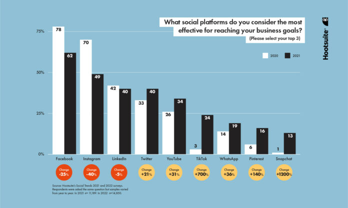 Las plataformas que los encuestados consideran más efectivas para alcanzar sus objetivos empresariales son Facebook (62%), Instagram (49%) y LinkedIn y Twitter (40%).