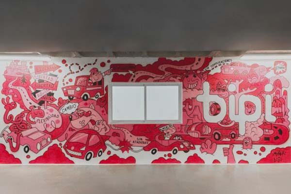 Gracias a la colaboración del artista Moñux, este emplazamiento se llenará de vida y color gracias a sus diseños inspirados en el cambio, la flexibilidad y la libertad, los pilares clave de Bipi. Enfocado en la imaginación y todas las posibilidades que puede aportar el tener un nuevo coche, el artista ha optado por representar estos conceptos a través de divertidos personajes de todo tipo, haciendo alusión a que, sea como sea cada uno, Bipi tiene un coche de suscripción para todos.