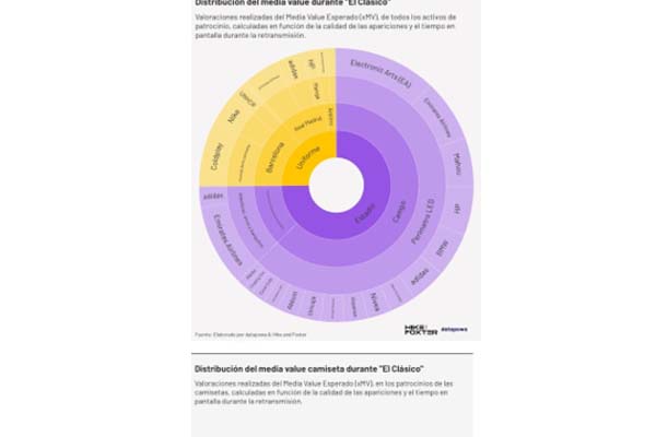 El increíble alcance del partido más importante de la liga doméstica de fútbol se destacó nuevamente el pasado sábado, 2 de noviembre, por la noche, cuando el Real Madrid CF y el FC Barcelona generaron más de 60 millones de euros en visibilidad mediátia para los patrocinadores de ambos clubes, La Liga y la RFEF, según un estudio de la compañía londinense de análisis de patrocinio, datapowa.