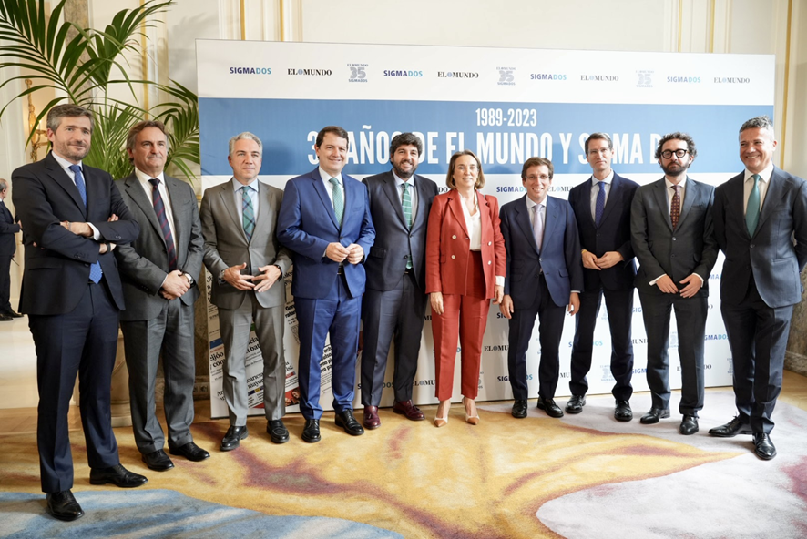 Luis Hernández, CEO de Sigma Dos; Marco Pompignoni, presidente ejecutivo de Unidad Editorial; Elías Bendodo, coordinador general del PP; Alfonso Fdez. Mañueco, presidente de Castilla y León; Fernando López Miras, presidente de Murcia; Cuca Gamarra, secretaria general del PP; Gonzalo Capellán de Miguel, presidente de La Rioja; Joaquín Manso, director de El Mundo y Gerardo Iracheta, presidente de Sigma Dos.