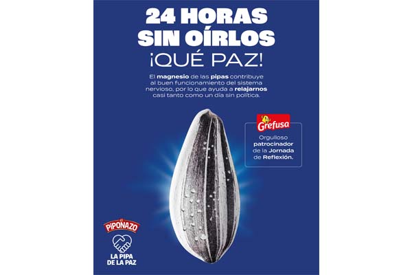 “Dentro de nuestra aventura diaria por sorprender a la población, decidimos apostar por ‘el patrocinio’ de la jornada de la reflexión animando a relajarse con las pipas de Grefusa después de unos meses con un ambiente muy crispado a nivel político, desarrollando una campaña multiformato que nos permita llegar a todo el electorado”, explica Rafa Gandía, director de marketing de Grefusa.