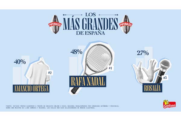 Rafa Nadal ha sido elegido por los españoles como el “Más Grande” de España en la actualidad, según un reciente estudio llevado a cabo por El Piponazo de Grefusa, que ahora cuenta con pipas aún más grandes. La marca ha querido rendir homenaje a las personas, momentos y tradiciones más admiradas de nuestra cultura popular con motivo de su campaña para encontrar al “Más Grande” de España y convertirlo en un auténtico lord o lady de El Piponazo.