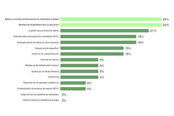 Para hacer frente a la escasez de profesionales cualificados, las empresas del sector están poniendo en marcha diversas estrategias para atraer y retener el talento que necesitan. Un 24% de las compañías apuesta tanto por la mejora y reciclaje profesional de los empleados actuales, capacitando al talento interno en competencias esenciales para adaptarse a los cambios del mercado; como por la flexibilidad sobre la ubicación, facilitando el teletrabajo o modelos híbridos. Además, un 21% de las compañías está apostando por explotar nuevos nichos de trabajo, recurriendo a perfiles no tradicionales.