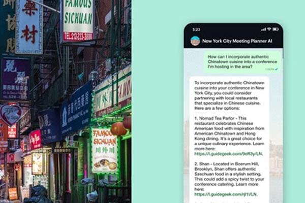 Los organizadores de eventos pueden hacer preguntas a Ellis, como: “¿Cuál es una sala con una vista impresionante del horizonte de la ciudad que puedo alquilar para una reunión de 50 personas?” o “¿Cómo puedo incorporar auténtica gastronomía de Chinatown en una conferencia que organizo en esa zona?”, y recibir respuestas instantáneas y detalladas.