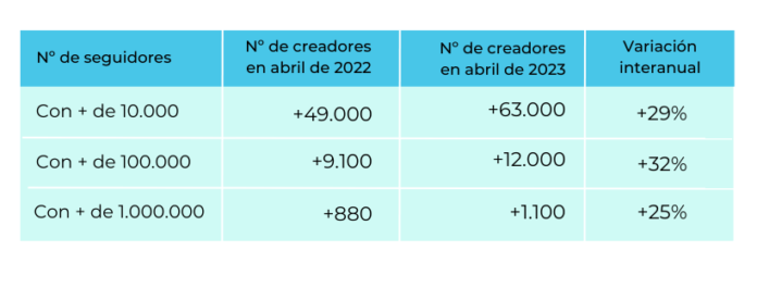 Así, los creadores con más de 100.000 seguidores son ahora un 32% más. El número de macroinfluencers, aquellos con más de un millón de seguidores, se ha incrementado en un 25%. Y los creadores de contenido denominados microinfluencers -quienes no tienen tantos seguidores como para vivir al 100% de sus contenidos- también han crecido un 29%.