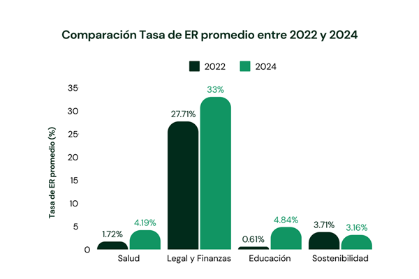 ● Educación: El engagement rate promedio creció de un 0,61% en 2022 a un 4,84% en 2024, impulsado por formatos de alto rendimiento e interacción como Instagram Reels y Posts, y con un EMV en alza, indicando un interés continuo en contenido educativo.