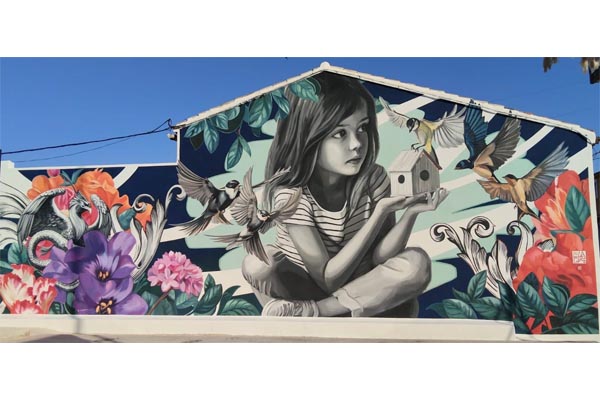 El mural, situado en una de las paredes de la zona polideportiva de Letur, muestra a una niña en el centro de la composición sosteniendo una casa de pájaros. A su alrededor, varias golondrinas vuelan en círculos en un entorno con vegetación viva. Esta imagen representa a Letur como el hogar donde la vida se renueva, con raíces firmes y alas abiertas para quienes están y para los que vendrán.