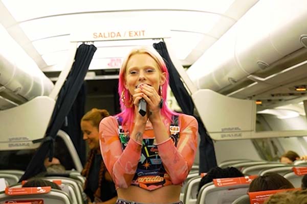 El avión vinilado con diseño de Mad Cool recorrió, este 5 de julio, la ruta Londres Gatwick -Madrid con salida desde la capital inglesa a las 20.45 h. Durante el viaje, los pasajeros recibieron un welcome pack con distintos regalos como pulseras luminosas, calcomanías, identificadores de maleta, gafas de sol y otras sorpresas, y disfrutaron de la actuación en directo de la cantante y rapera británica Girli, que este año forma parte del cartel del festival.