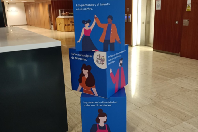- Photocall en todas las sedes: Para llegar con garantías a los plazos de una manera mucho más visual y eficaz, se planteó diseñar (en vez de un photocall al uso) un tótem o corpóreo inusual, modular y muy fácilmente transportable formado por cubos para su fácil manipulación por medio de los responsables locales de la compañía y campaña. Se crearon renders a modo de guía de dichos cubos para los departamentos de RRHH de las distintas sedes destino. En vez de un photocall para cada sede se realizaron tres cubos diferentes (a dos idiomas) para cada sede y que el personal pudiera jugar moviéndolos independientemente de su orientación sin que el mensaje perdiera efectividad.