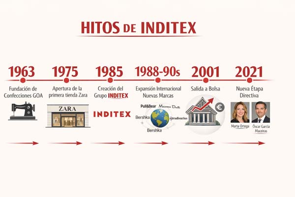 El éxito de Zara fue tal que, en 1985, Ortega decidió estructurar sus operaciones bajo una nueva sociedad matriz: Inditex (Industria de Diseño Textil S.A.). La idea era agrupar bajo un mismo paraguas todas las actividades de diseño, fabricación y comercialización, consolidando un modelo integrado verticalmente que le daría una enorme ventaja competitiva.