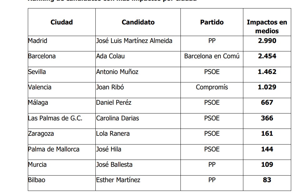 el PSOE y el PP, con 4.360 y 3.269 impactos respectivamente seguidos por Barcelona