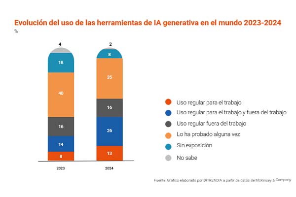 La evolución del uso de las herramientas de inteligencia artificial generativa a nivel global en el último año por parte de los consumidores también ha sido significativa, tanto en el ámbito laboral como fuera de él. En 2024, ya el 26% de los usuarios ha empleado estas herramientas de manera habitual fuera del trabajo, en comparación con el 16% del año anterior. Además, la proporción de personas que no utiliza o sólo ha probado una vez estas herramientas disminuye significativamente, lo que refleja el rápido avance en la penetración de la IA generativa en todos los ámbitos.