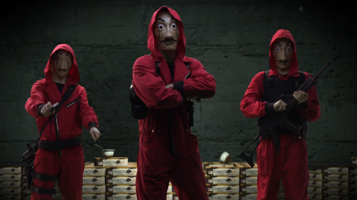 “Soy Carla, la community manager de Oikos, y he sido secuestrada por la banda”, así empieza el video que Oikos subió a sus redes sociales el pasado viernes. En él, se ve como los atracadores, vestidos con su característico mono rojo y careta de Dalí, se pasean por las oficinas de Danone en plena noche para quedarse con todos los Oikos. “Pero hay una cosa con la que el profesor no contaba, los community siempre hacemos horas de más”, concluye Carla.