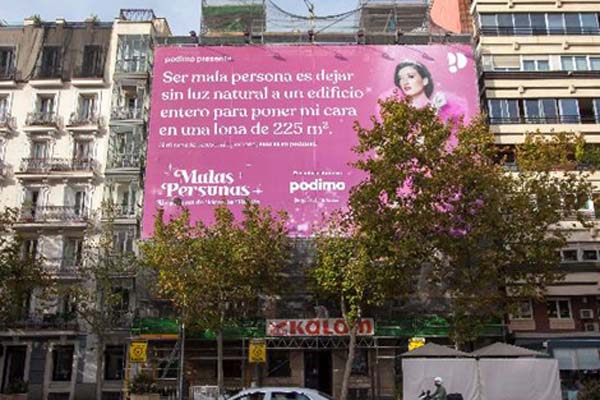 De igual forma, desde el pasado 13 de octubre Podimo desplegó una lona de gran tamaño en la calle Goya 105, frente al Wizink Center, que estará disponible hasta mediados de noviembre, en la que se puede leer: “Ser mala persona es dejar sin luz natural a un edificio entero para poner mi cara en una lona de 225m2“.