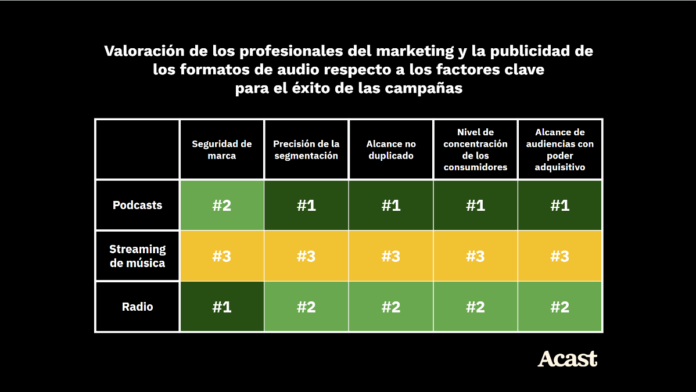 Al comparar los podcasts con la música en streaming y la radio, los profesionales del marketing clasificaron sistemáticamente los podcasts como los de mayor rendimiento en cuanto a la precisión de la segmentación y el alcance no duplicado. El podcast también fue la primera opción en cuanto a la conexión con audiencias mentalmente más concentradas en el contenido que escuchan. Sin embargo, clasificaron el medio en segundo lugar en cuanto a seguridad de marca, área en la que la radio se sigue considerando líder.