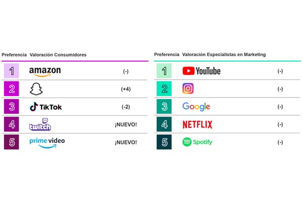 La clasificación de los consumidores la dominan las marcas de Amazon, con Amazon en primer lugar, Twitch en cuarto y Prime Video en quinto. Las otras dos marcas en el top cinco de los consumidores son Snapchat en segundo lugar y TikTok en tercero.