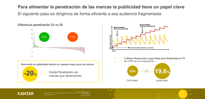 La publicidad se sigue mostrando como una de las herramientas más eficaces para dar visibilidad a las marcas. En plena evolución hacia formatos más digitales y segmentados, los datos indican que las marcas que desinvierten en publicidad pierden de media un 20% de penetración en sus respectivos mercados. Además, la publicidad premia la inversión a largo plazo multiplicando por cuatro la penetración que consiguen las marcas con respecto a las inversiones publicitarias cortoplacistas, según el informe ‘Manual de publicidad para ganar compradores’, de Kantar Worldpanel.