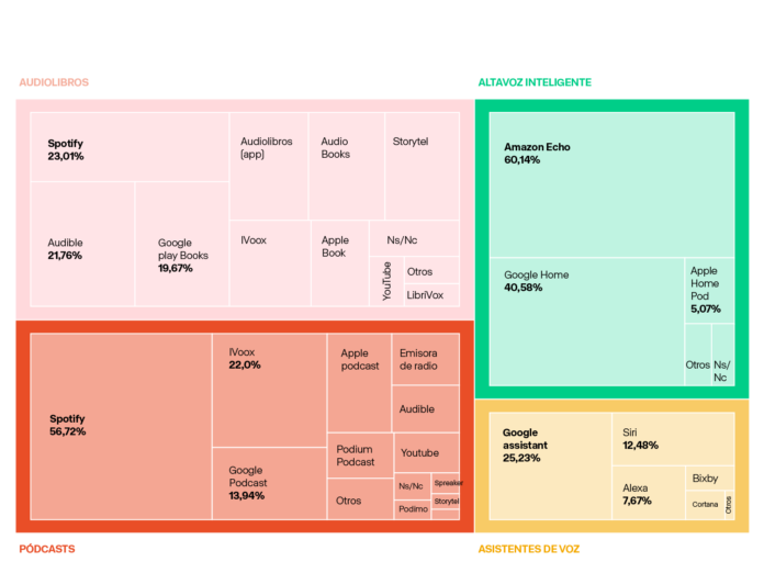 En el caso de las plataformas de reproducción, pódcast y audiolibros también van a la par. La empresa de servicios multimedia sueca Spotify sigue consolidándose como la plataforma más usada en España para estos servicios. Un 57 % de los consumidores de pódcast lo hacen a través de esta vía de reproducción y en el caso de los audiolibros este porcentaje es Prodigioso Volcán del 23 %. Por su parte, iVoox, el servicio de escucha online español, es la segunda plataforma más empleada.
