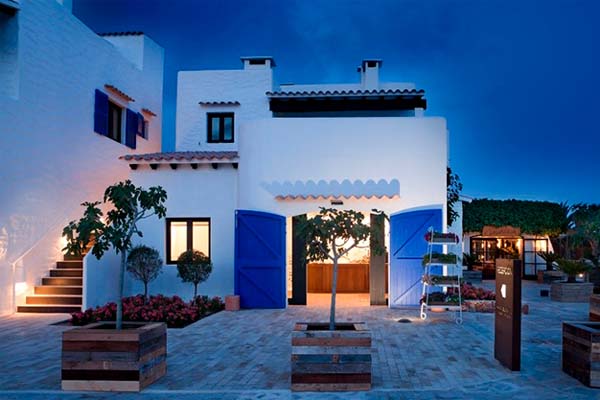 Las construcciones del complejo, con sus paredes encaladas, sus contraventanas de azul intenso y las cálidas texturas de sus maderas, se integran con armonía en un paisaje en el que los frondosos jardines de colores vibrantes se mezclan con la vegetación autóctona de la isla.