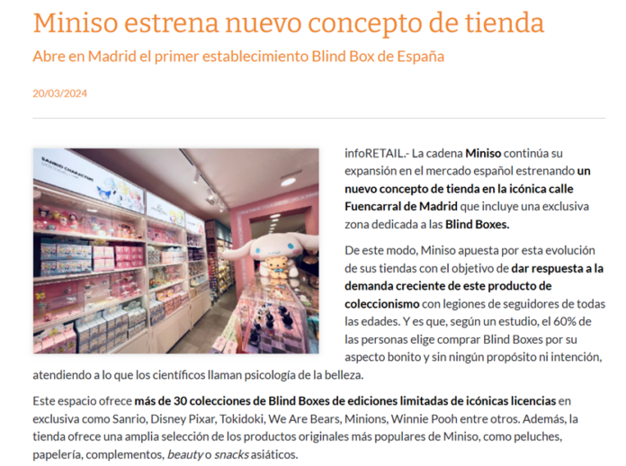 Relaciones con medios. Se presentó MINISO a contactos clave de los medios, asegurando una correcta posición de la marca en el mercado español. A lo largo del año se aseguraron más de 70 apariciones en medios de Tier 1, destacando el diseño innovador de la tienda y su exclusiva línea de productos licenciados.