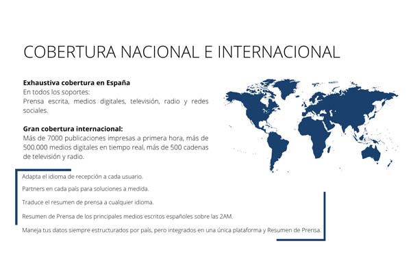 Integramos la monitorización completa de medios en España —prensa escrita, medios digitales, redes sociales, televisión y radio— con una tecnología innovadora que incorpora los últimos avances en machine learning y procesamiento del lenguaje natural (NLP).