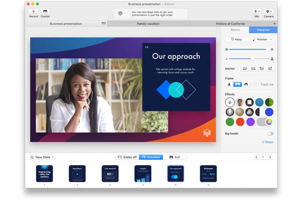 Ilustrar y destacar el contenido: mmhmm permite centrarse en los puntos clave del discurso, utilizando el refuerzo visual.