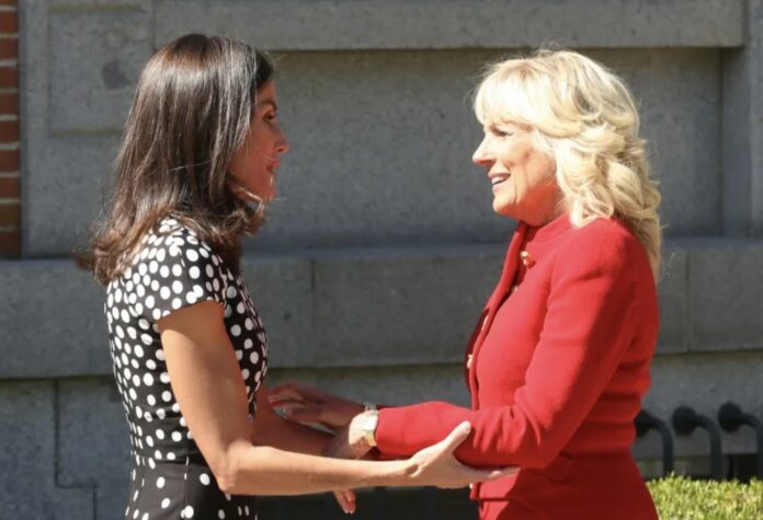 Jill Biden, esposa del presidente de los Estados Unidos ha sido recibida hoy por la Reina Letizia. El encuentro en el Palacio de la Zarzuela ha sido muy cordial. Observamos de entrada como doña Letizia recibe en el exterior, con los brazos abiertos, a la primera dama de Estados Unidos en señal de buena acogida y expectativas de amistad.
