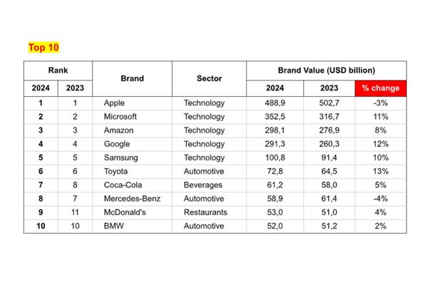 Apple sigue siendo la marca más valiosa, pero su valor ha caído por primera vez en más de dos décadas (-3%). “Mientras otros se han precipitado hacia la IA, Apple ha querido asegurarse de que sus lanzamientos se alineaban con sus valores de privacidad. Es decir, que la marca ha priorizado la confianza en el largo plazo a los beneficios a corto plazo. De hecho, sus acciones han subido un 20% interanual y en Interbrand prevemos que su valor aumente en edición de 2025”, ha asegurado el Global Director, Brand Economics de Interbrand, Greg Silverman.