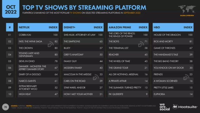 Por otro lado, según Hootsuite, y de acuerdo con Flixpatrol, algunas de las películas más vistas en el mes de septiembre en las diferentes plataformas de streaming fueron: La villa del amor (Netflix), Thor: Love and Thunder (Disney+), Samaritan (Amazon Prime Video), y Elvis (HBO). En cuanto a las series más vistas a nivel mundial destacaron: Cobra Kai (Netflix), She-Hulk: Abogada Hulka (Disney+), Los anillos del poder (Amazon Prime Video) y La casa del dragón (HBO).