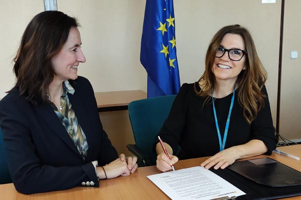 En el acto de firma, al que asistió Paula Carrera, estuvieron también presentes María Andrés, directora de la Oficina del Parlamento Europeo en España y Marina Gomáriz, responsable de prensa de la Oficina del Parlamento Europeo en España, promotoras ambas de la iniciativa #DóndeEstánEllas.