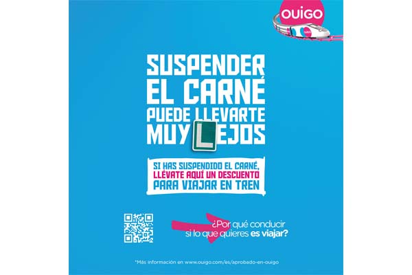 Desarrollada de la mano de Havas Creative, esta ejecución mantiene el distintivo tono de la marca y coloca a los jóvenes madrileños que aún no han obtenido el carnet de conducir en el centro de la narrativa. Esta estrategia se despliega en un emplazamiento clave: Móstoles, el municipio madrileño donde la campaña de exterior tendrá lugar y en la que los examinados acuden al centro de exámenes a probar suerte. Una ubicación en la que los aspirantes serán impactados y motivados a viajar en alta velocidad gracias a un descuento exclusivo de 10€ para viajar con OUIGO, permitiéndoles seguir descubriendo destinos sin preocupaciones entre cualquiera de las ciudades que opera la marca: Madrid, Barcelona, Zaragoza, Tarragona, Valencia, Valladolid, Segovia, Cuenca, Alicante o Albacete.