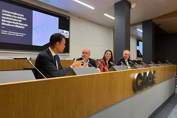 Cebrián inauguró la mesa redonda reflexionando sobre la importancia que supone actualmente la conducta ética ejemplar, que, según datos de Villafañe, encabeza la lista de atributos reputacionales con más importancia para los líderes empresariales. El director de Villafañe planteó además a los directivos una conversación sobre la demanda progresiva del componente ético que exigen los grupos de interés de las compañías: “desde hace unos pocos años, la ética ha entrado en el frontispicio de las principales variables que componen la reputación de compañías y líderes empresariales”.